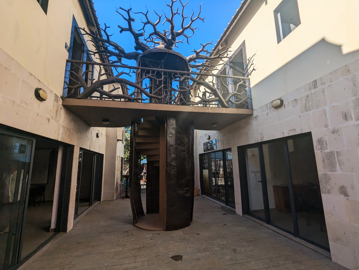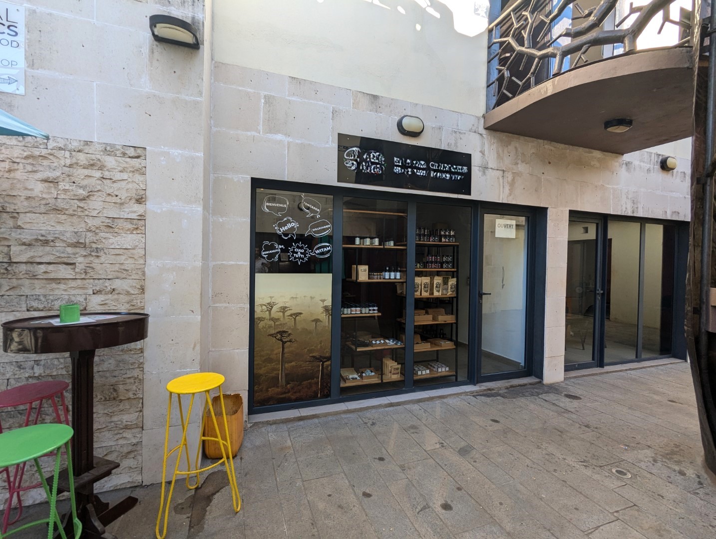 A/ Premier front > bord de route : grand bâtiment à étage incluant des murs commerciaux et chambres d’hôtes