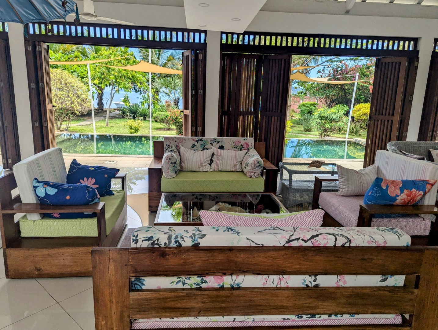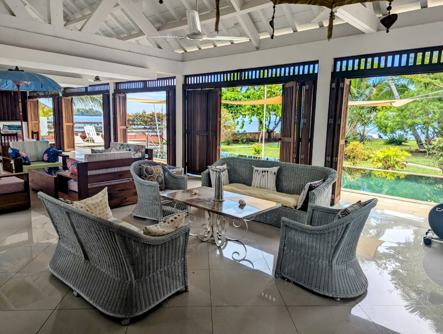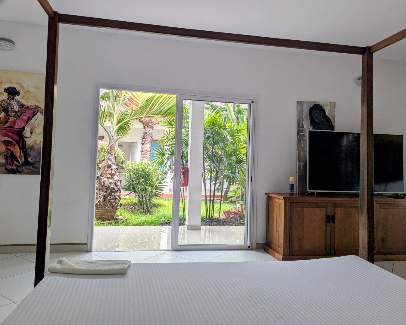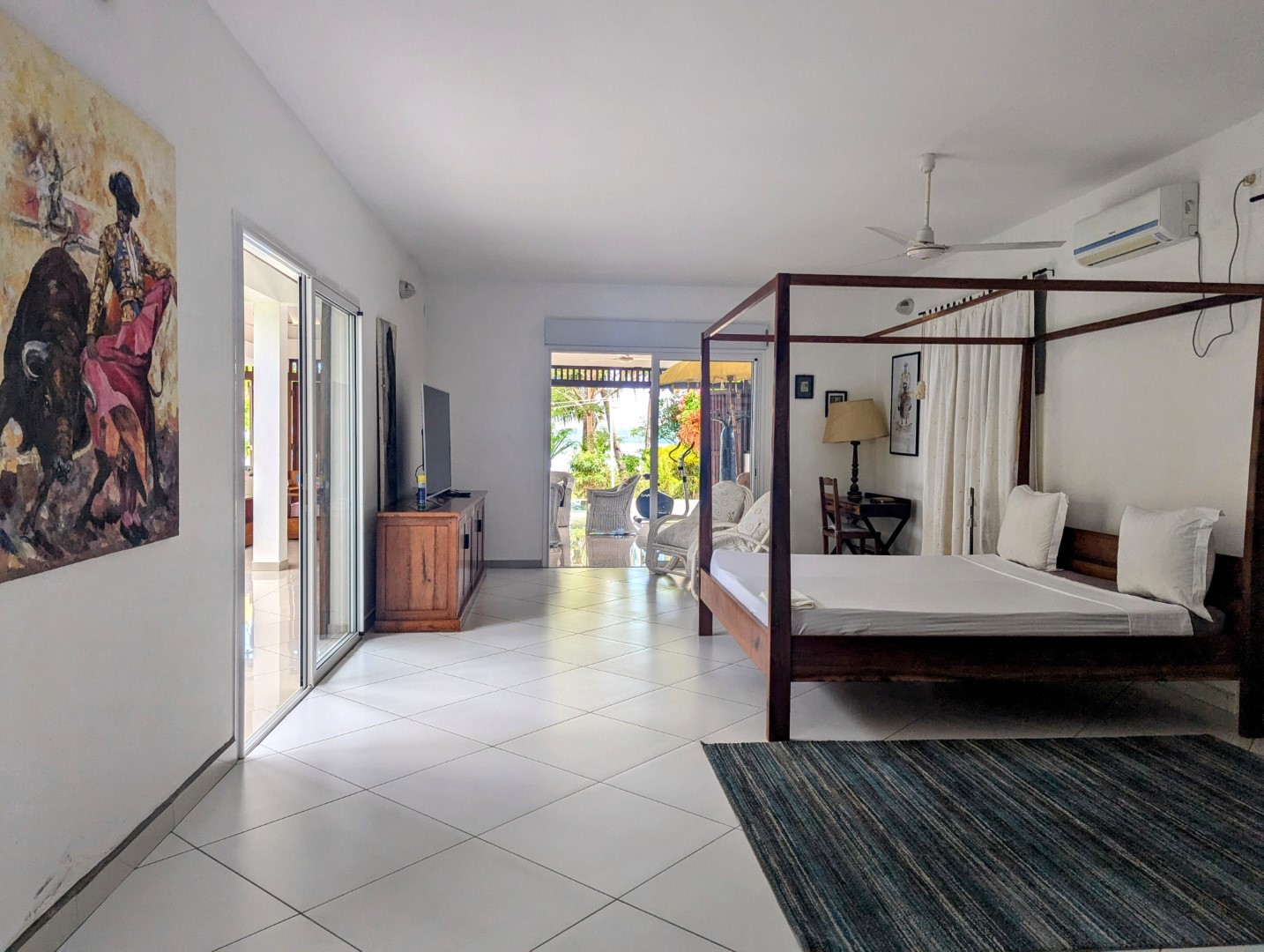 - 1 grand séjour ouvert donnant sur une piscine face à un jardin et la plage